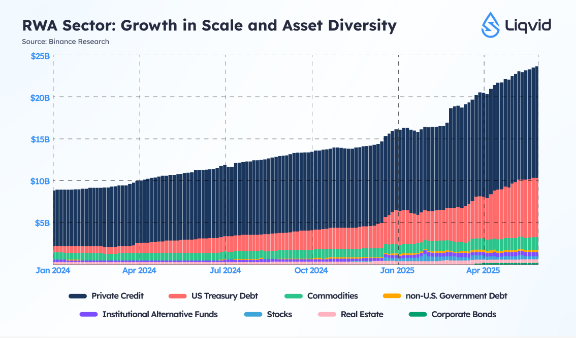 The first half of 2025 has firmly established real-world assets as one of the most rapidly institutionalizing verticals in crypto. No longer confined to proof-of-concept pilots or internal sandbox tests, traditional finance players are now bringing live tokenized products to market at scale. The tokenized RWA market grew from approximately $15.2 billion at the close of 2024 to over $24 billion by mid-2025, marking an 85% year-over-year increase and a 260% surge in issuance volume just in H1 alone. These are not speculative tokens, they represent U.S. Treasuries, private credit, gold, real estate, and money-market funds made natively composable on-chain.