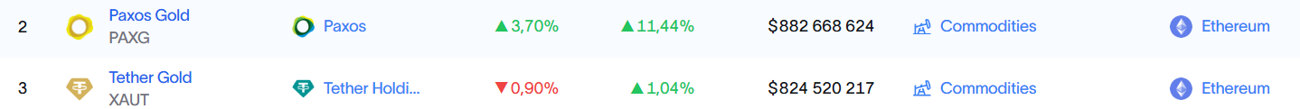 Gold-backed tokens such as Paxos Gold (PAXG) and Tether Gold (XAUT) have also gained traction, each surpassing $800 million in capitalization and reinforcing demand for asset-backed digital assets.