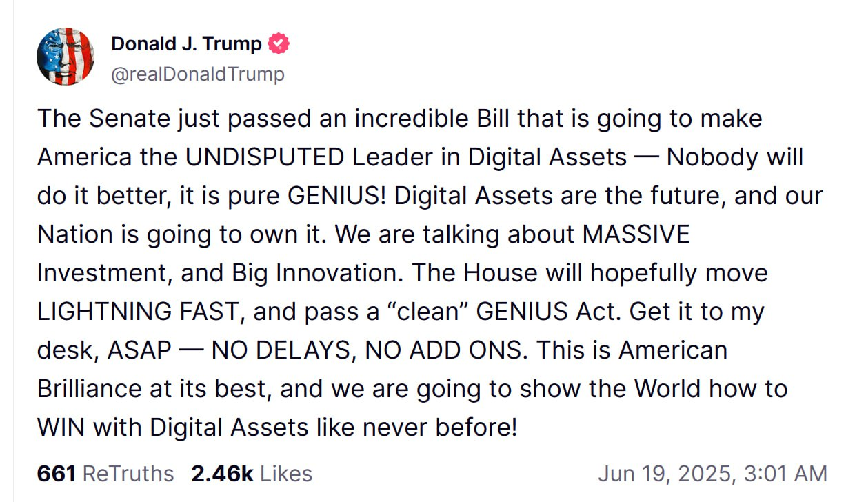 - The GENIUS Act – a landmark bipartisan bill establishing clear requirements for fiat-backed stablecoins, including full collateralization, routine audits, and AML compliance.