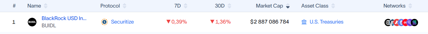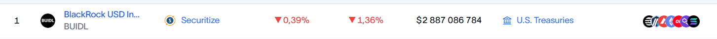 Among the protocols leading this growth, BlackRock’s BUIDL fund has emerged as the dominant force, with total value locked (TVL) reaching $2.8 billion outpacing any other player in the space. It is followed by Ethena’s USDtb, a synthetic dollar product with a TVL of $1.4 billion, and Ondo’s tokenized treasury offering, which has climbed to $1.3 billion.